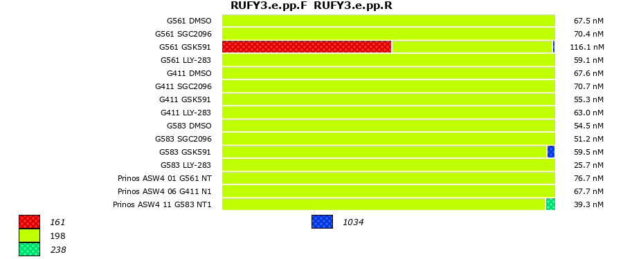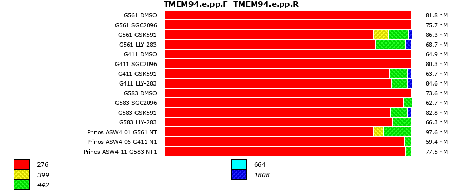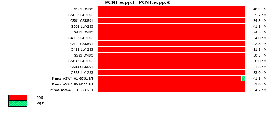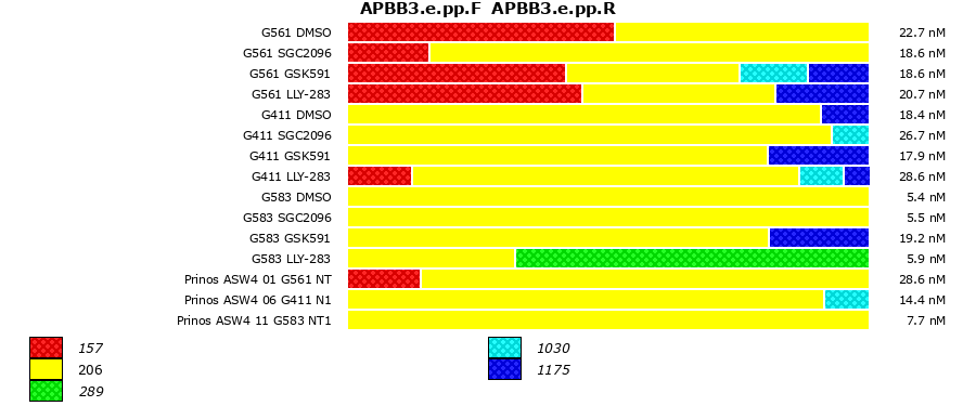 Peak ratio bar is representing, for each assay of a primer pair, relative expression of all detected PCR amplicons. For an assay, relative expression is shown as a stacked bar graph. Bar colors are matched to the amplicon's associated length (see legend below figure). The assay reaction total expression value (molarity) is shown at the right of each bar.