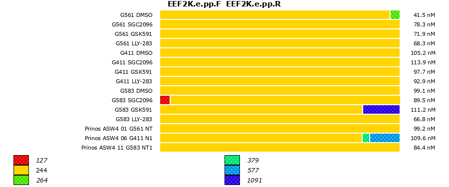 In the bar color legend, a solid color is used when the detected amplicon was matched to the length expected by primer design. If the color is cross-hatched, then this amplicon could not match any expected by primer design. This unexpected amplicon length is aligned across all assay reactions.