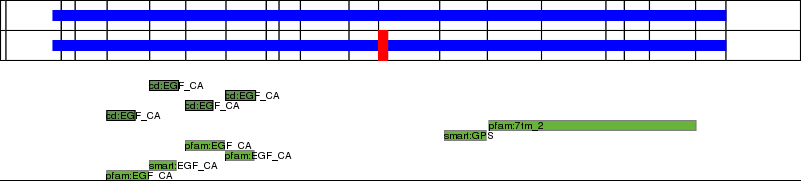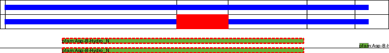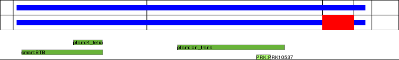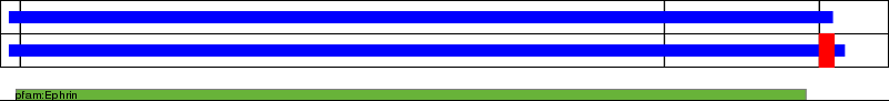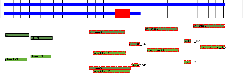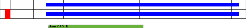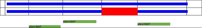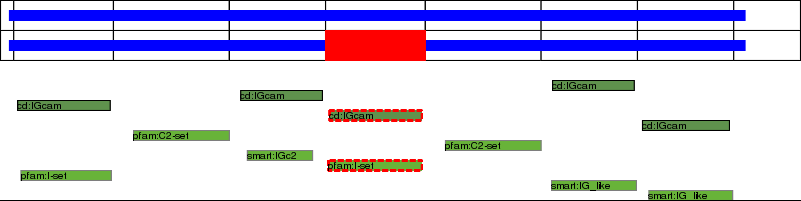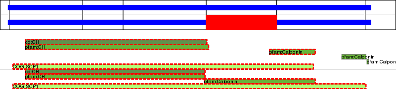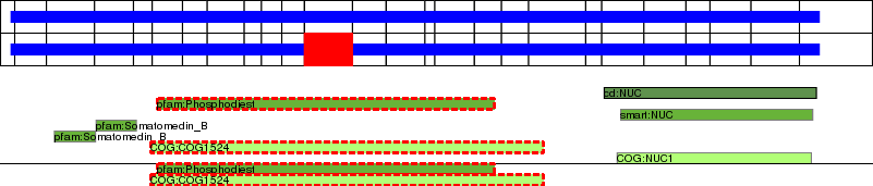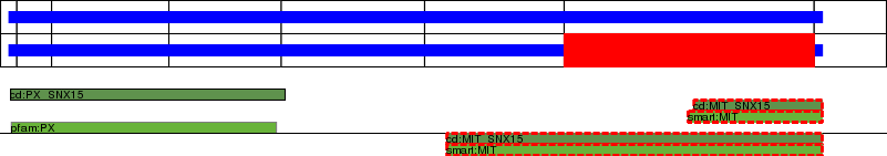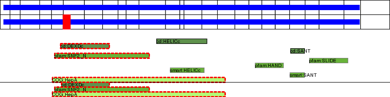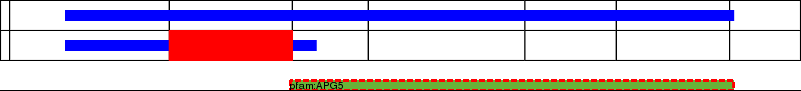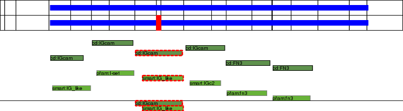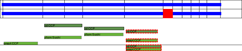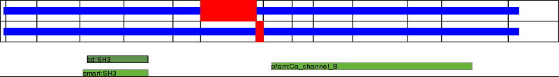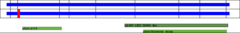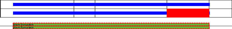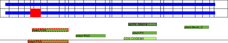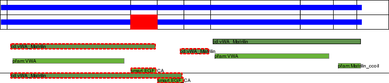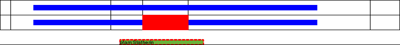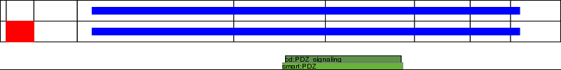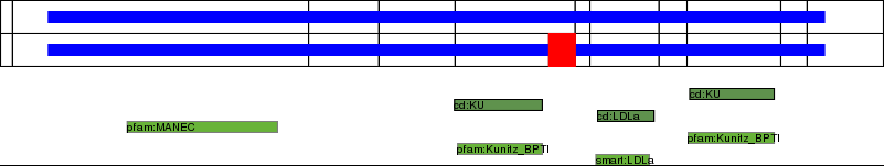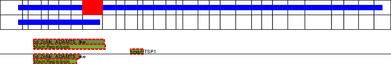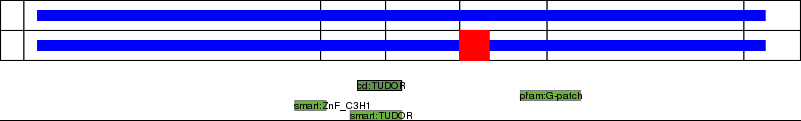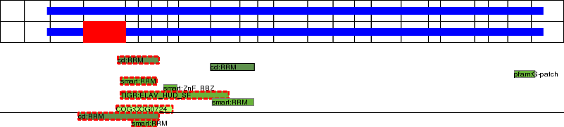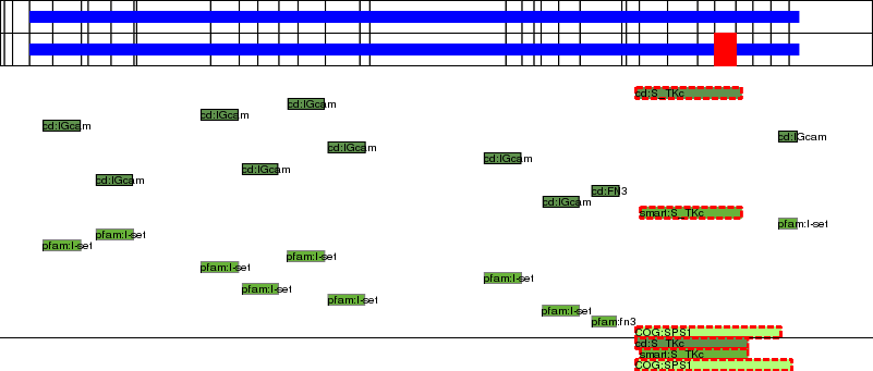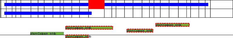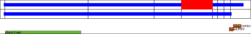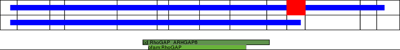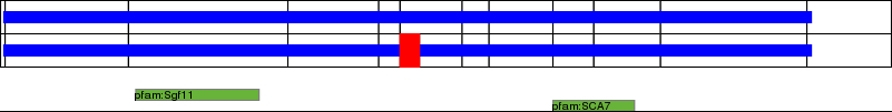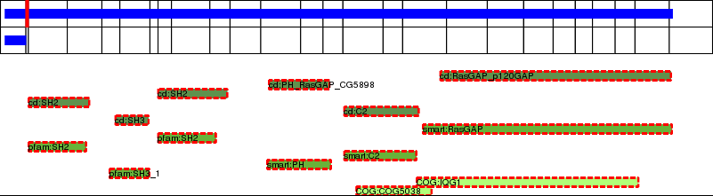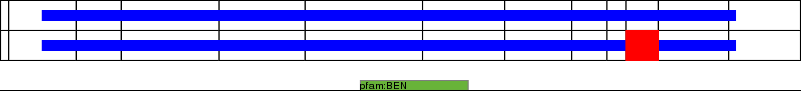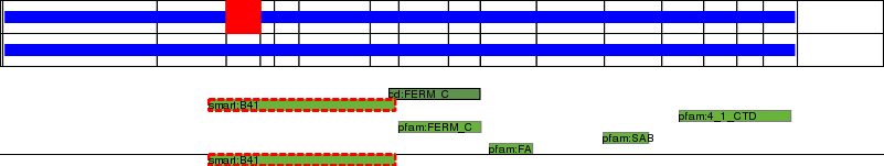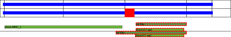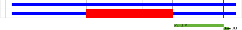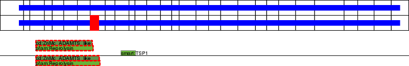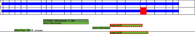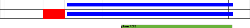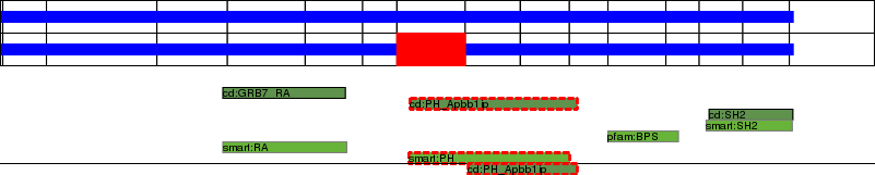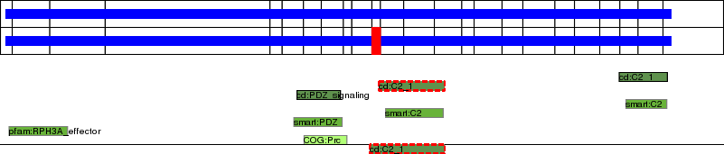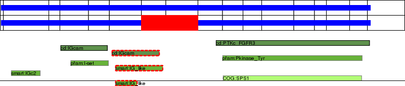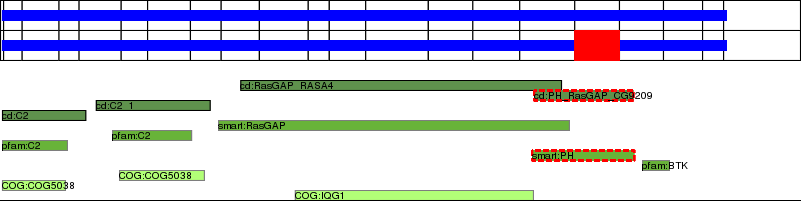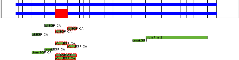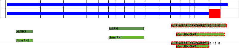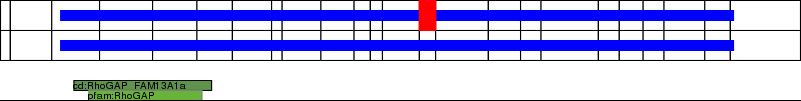 This page contains ASEs represented as a graph of the mRNA exonic structure mapped to the protein primary sequence. Exons are shown in white with black outline. The reference form is represented above the alternative form. Coding regions are shown with blue horizontal bars. These can be interrupted by red blocks for absent regions. Below are the domains in the protein obtained from NCBI's Conserved Domain Database. Domains that are affected by the ASE are outlined in red.