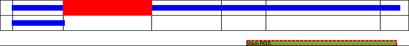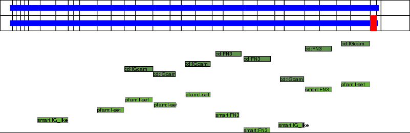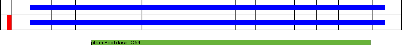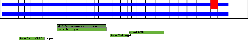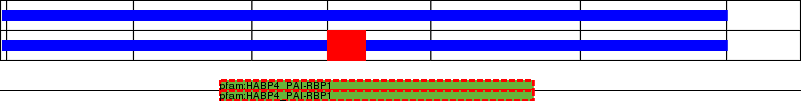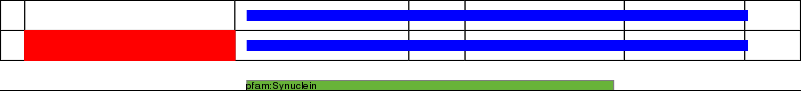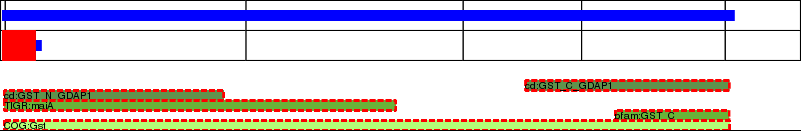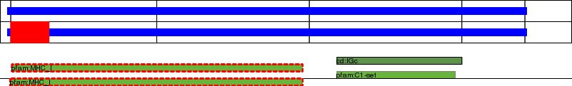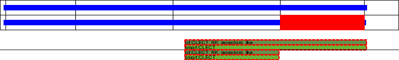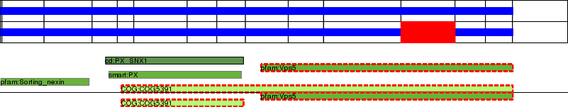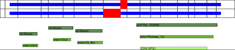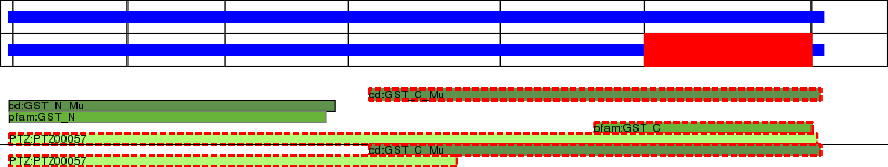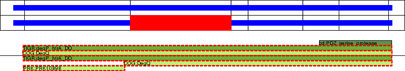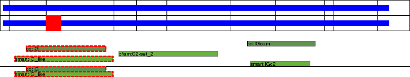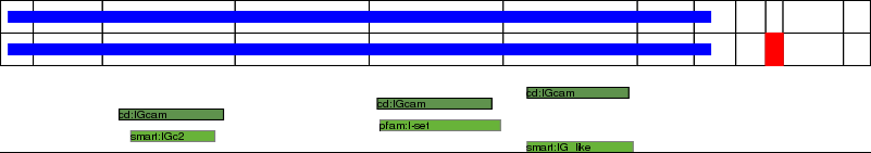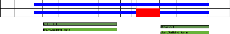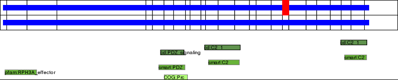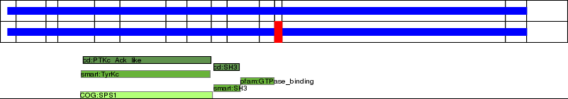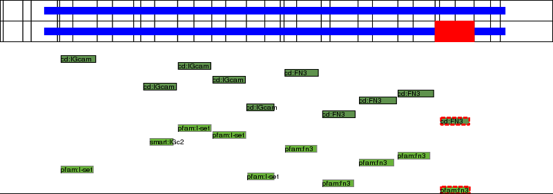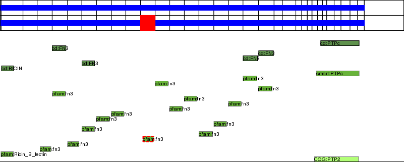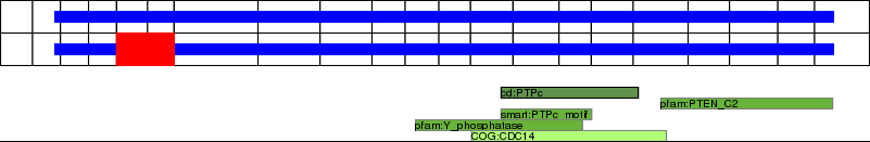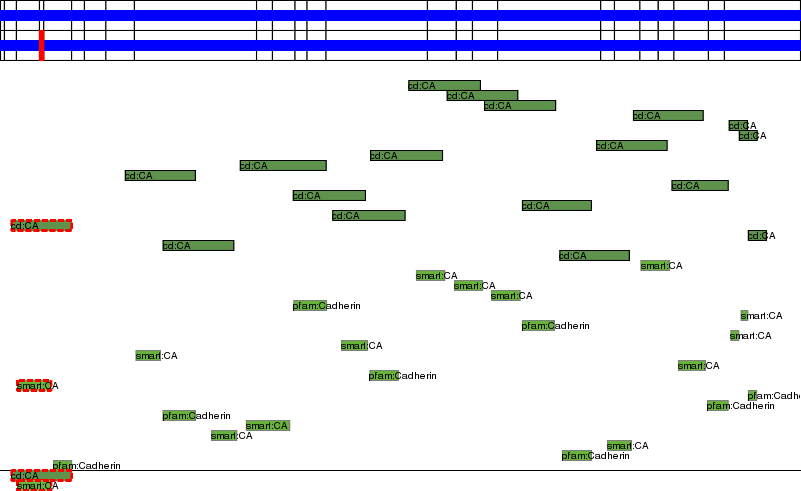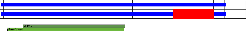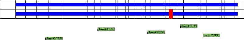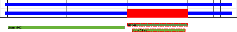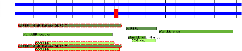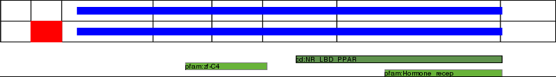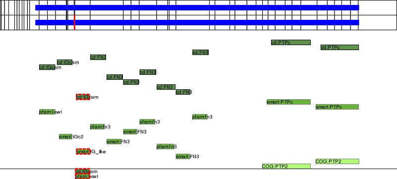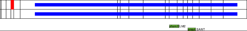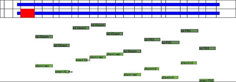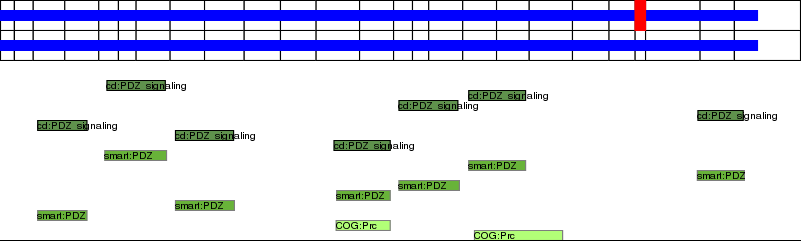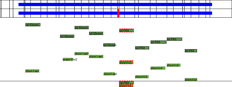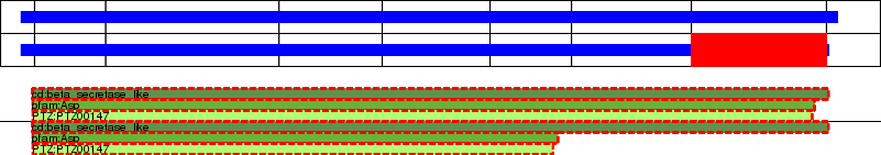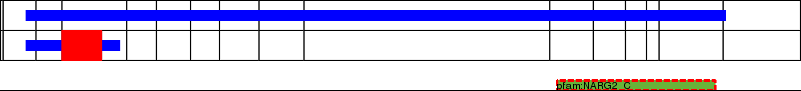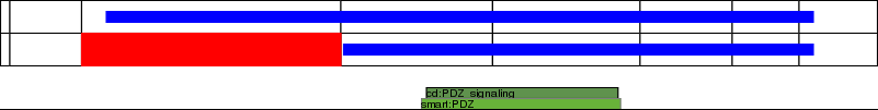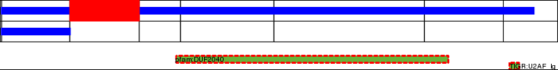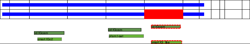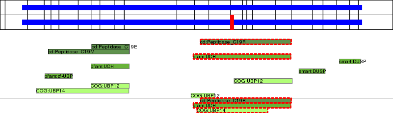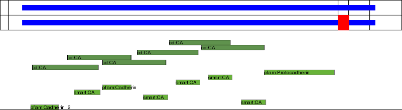 This page contains ASEs represented as a graph of the mRNA exonic structure mapped to the protein primary sequence. Exons are shown in white with black outline. The reference form is represented above the alternative form. Coding regions are shown with blue horizontal bars. These can be interrupted by red blocks for absent regions. Below are the domains in the protein obtained from NCBI's Conserved Domain Database. Domains that are affected by the ASE are outlined in red.