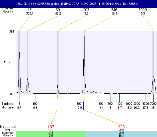 Fluorescence graphs : BCL2L12 / 6 / siZNF638_global_1|NIH:OVCAR-3-OK (2007-11-15 96hrs) / Well ID 1338341