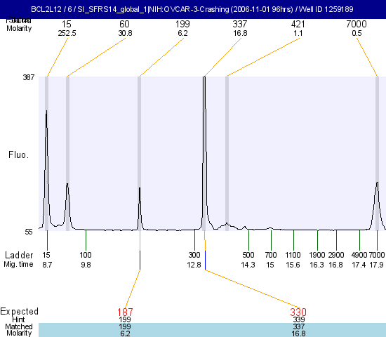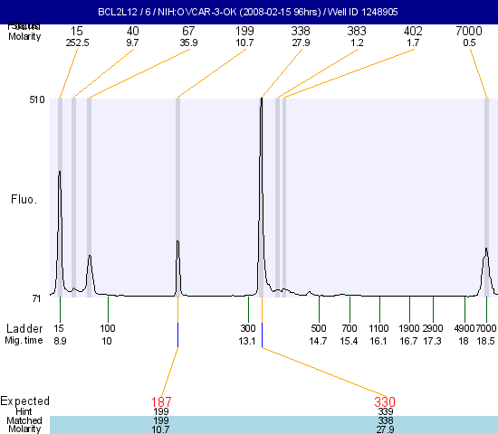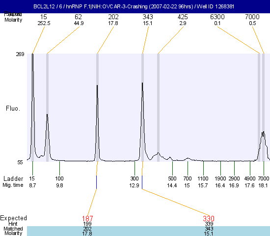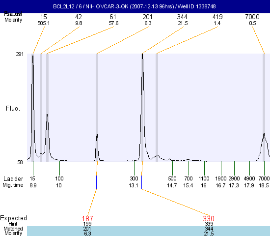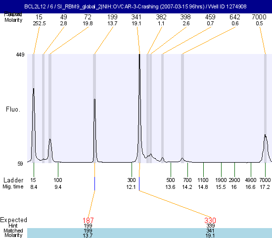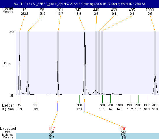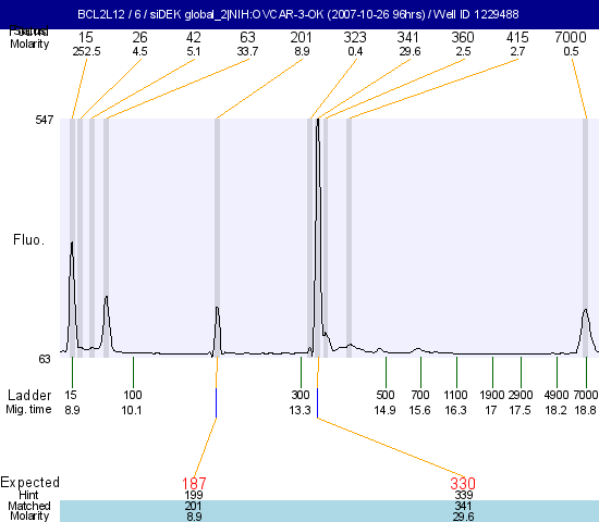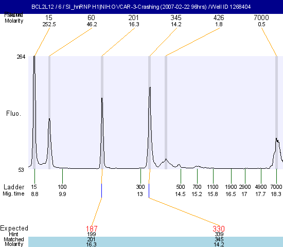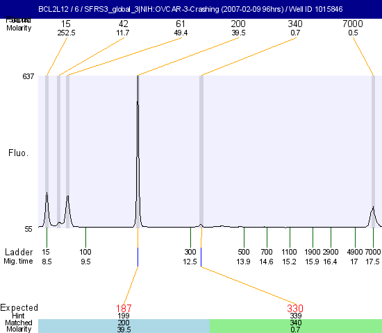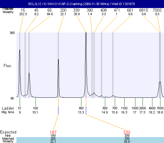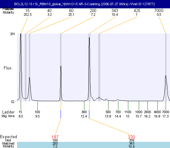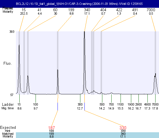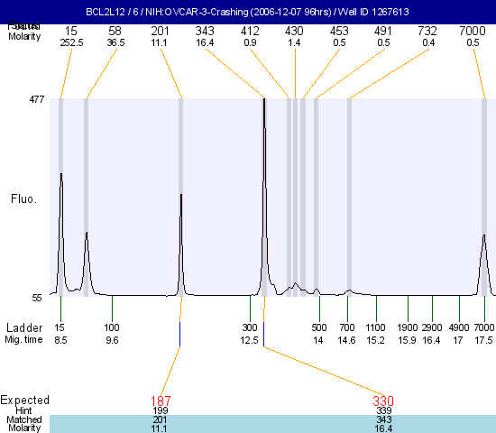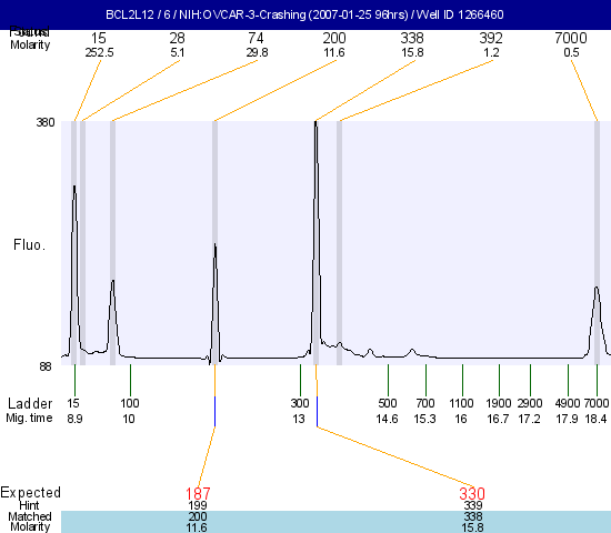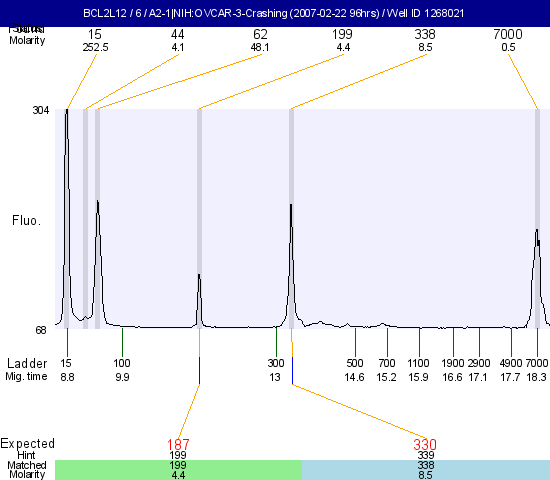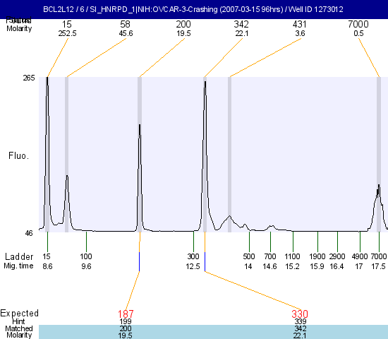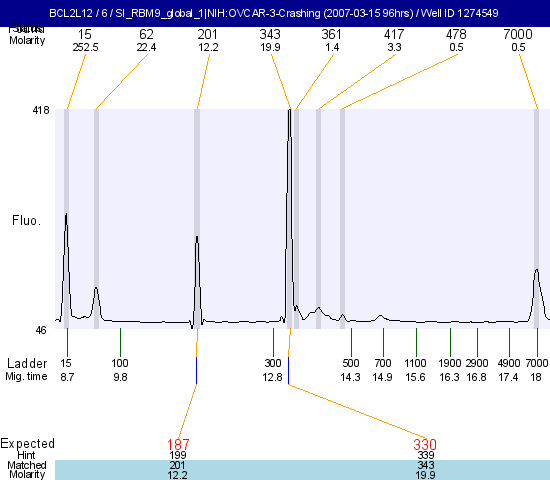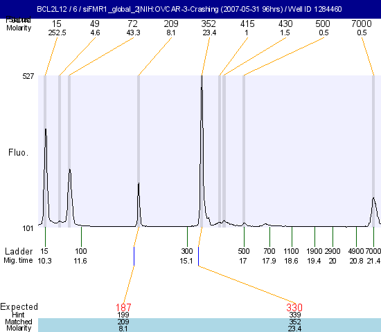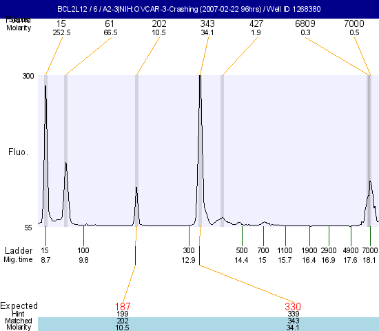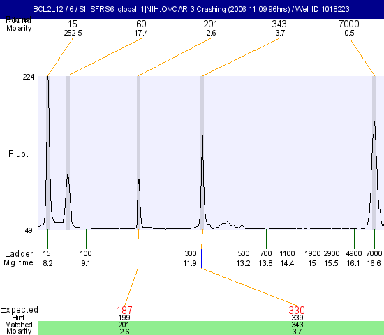 Fluorescence graphs : BCL2L12 / 6 / A2-3|NIH:OVCAR-3-Crashing (2007-02-22 96hrs) / Well ID 1268380