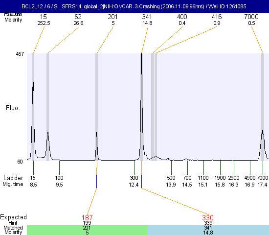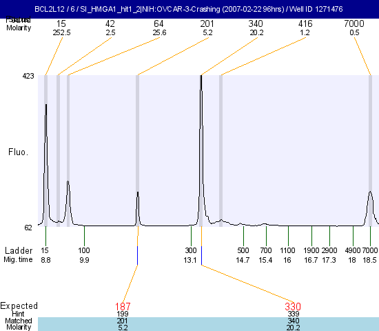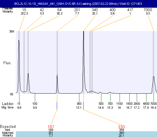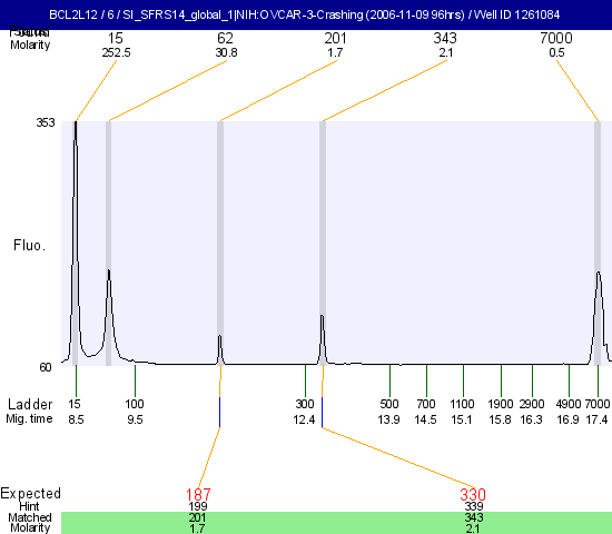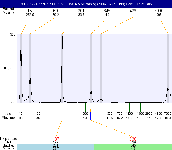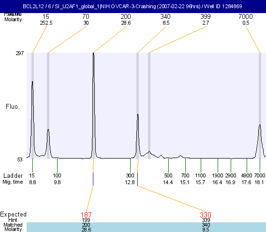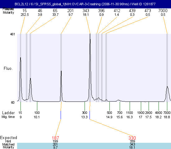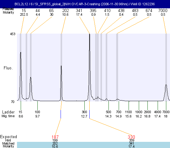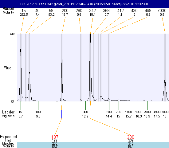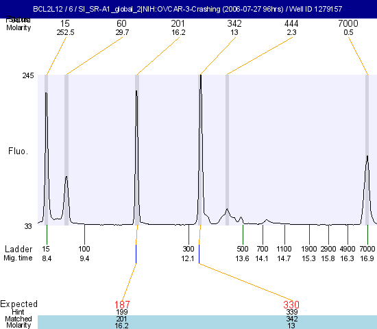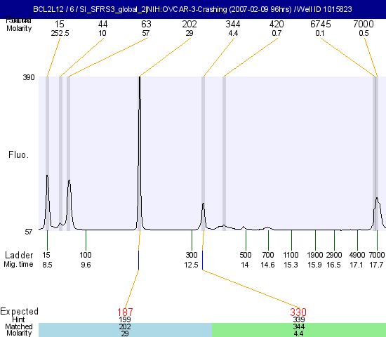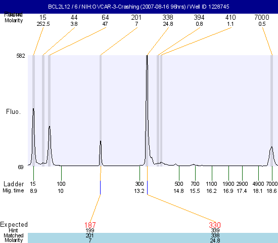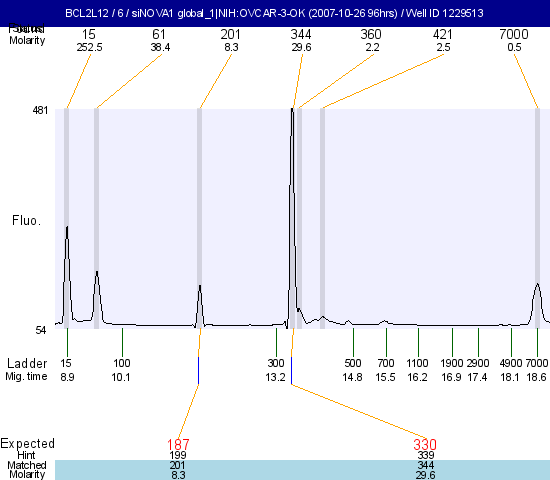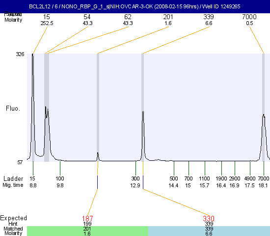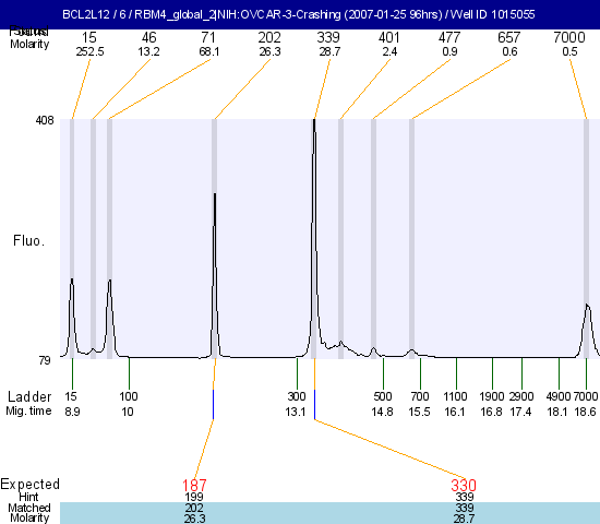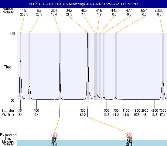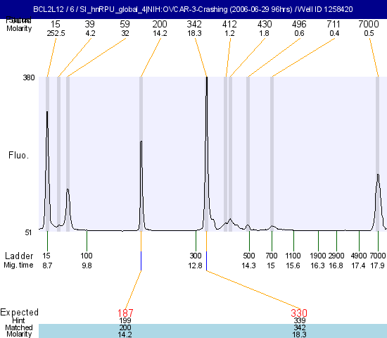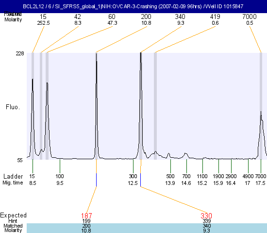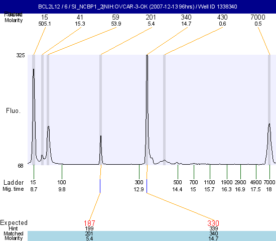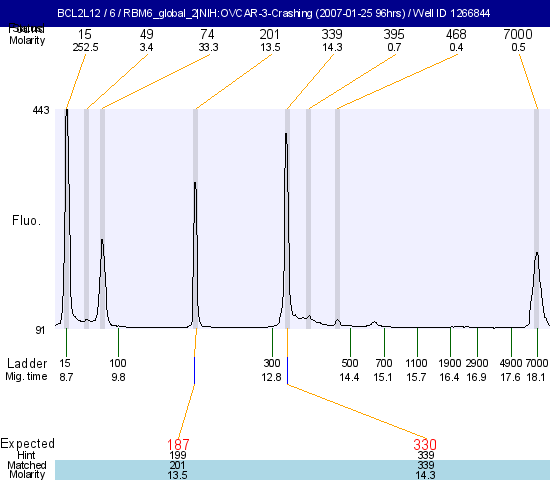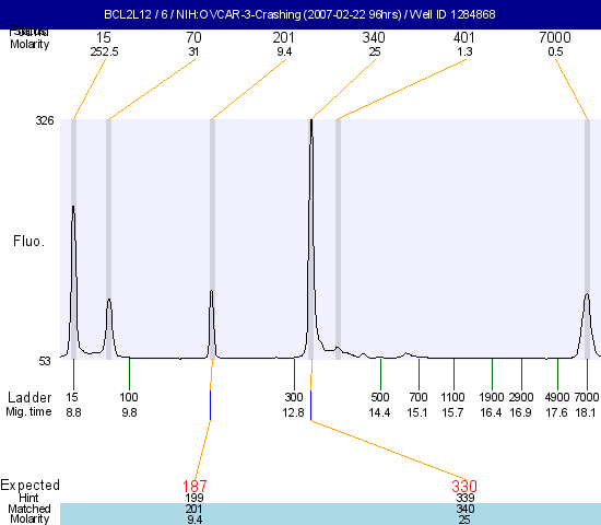 Fluorescence graphs : BCL2L12 / 6 / A2-3|NIH:OVCAR-3-Crashing (2007-02-22 96hrs) / Well ID 1268380