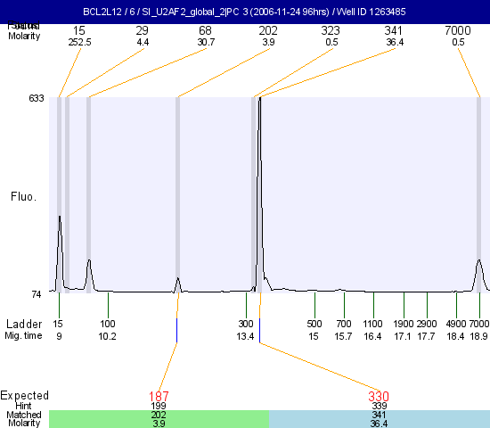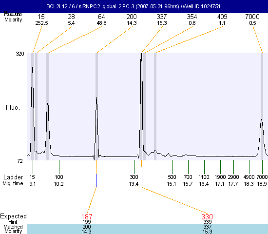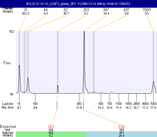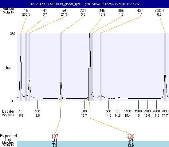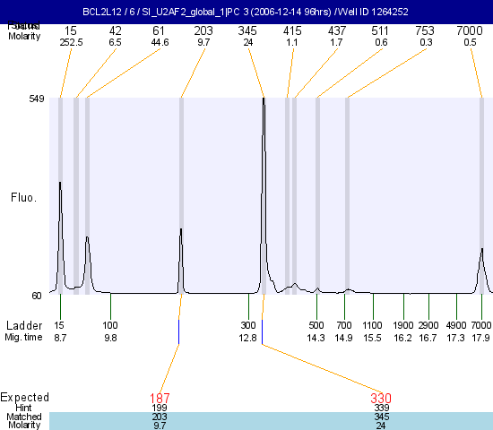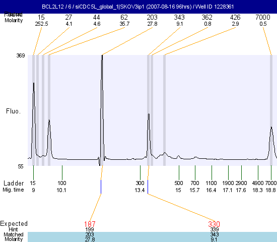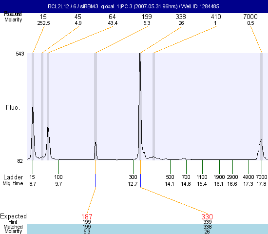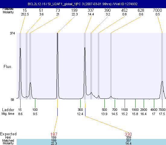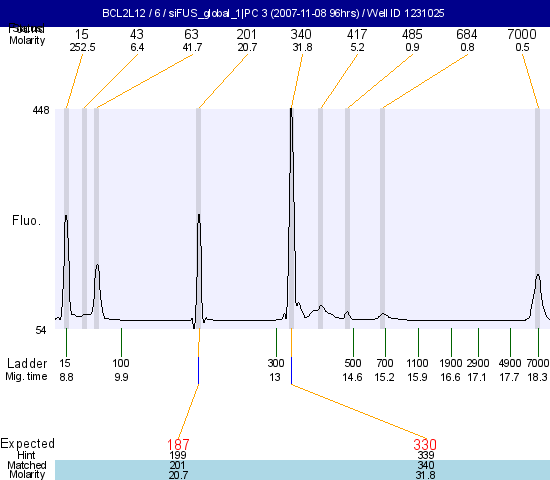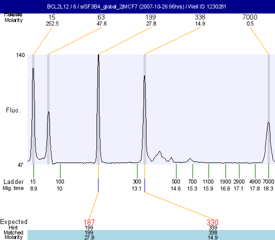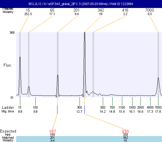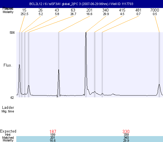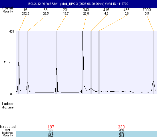Fluorescence graphs : BCL2L12 / 6 / siSF3A3_global_2|PC 3 (2007-05-03 96hrs) / Well ID 1222984