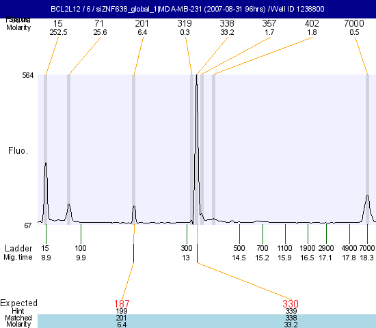Fluorescence graphs : BCL2L12 / 6 / siZNF638_global_1|MDA-MB-231 (2007-08-31 96hrs) / Well ID 1238800