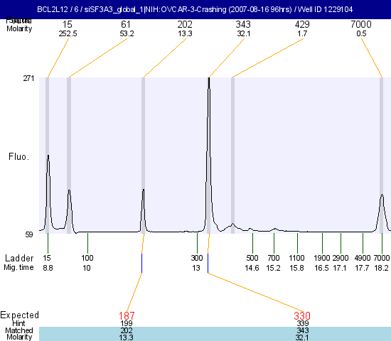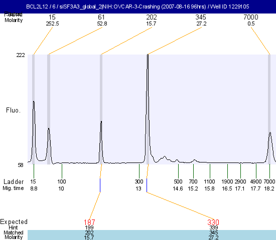 Fluorescence graphs : BCL2L12 / 6 / siSF3A3_global_2|NIH:OVCAR-3-Crashing (2007-08-16 96hrs) / Well ID 1229105
