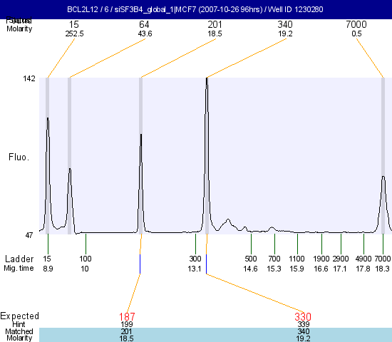 Fluorescence graphs : BCL2L12 / 6 / siSF3B4_global_1|MCF7 (2007-10-26 96hrs) / Well ID 1230280