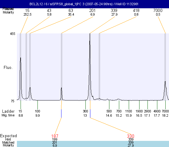 Fluorescence graphs : BCL2L12 / 6 / siSFRS8_global_2|PC 3 (2007-05-24 96hrs) / Well ID 1336421