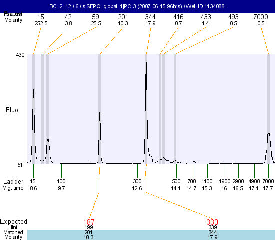 Fluorescence graphs : BCL2L12 / 6 / siSFPQ_global_1|PC 3 (2007-06-15 96hrs) / Well ID 1134088