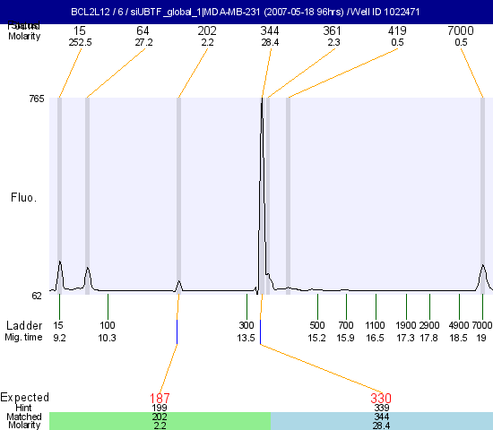 Fluorescence graphs : BCL2L12 / 6 / siUBTF_global_1|MDA-MB-231 (2007-05-18 96hrs) / Well ID 1022471