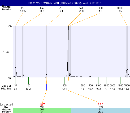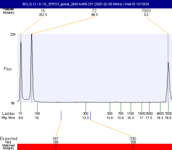 Fluorescence graphs : BCL2L12 / 6 / MDA-MB-231 (2007-02-08 96hrs) / Well ID 1015078