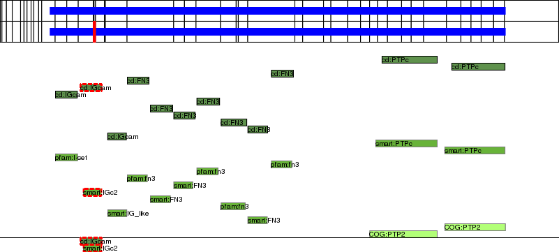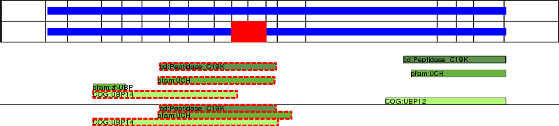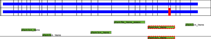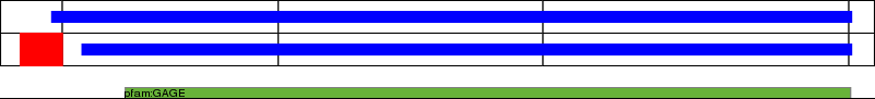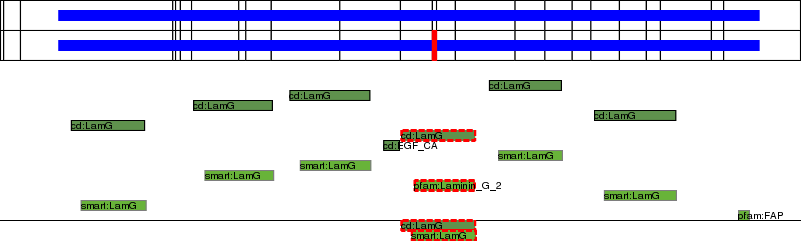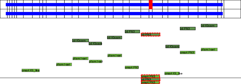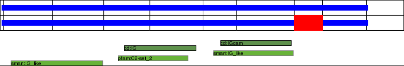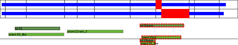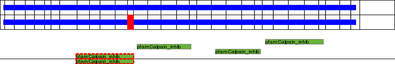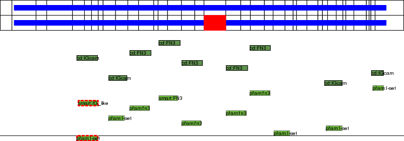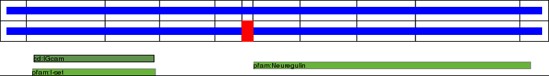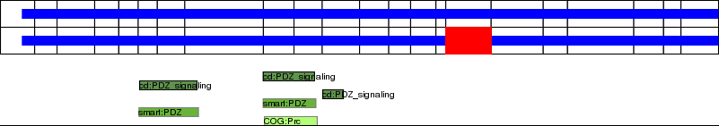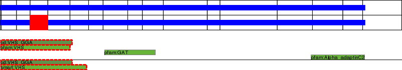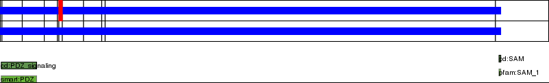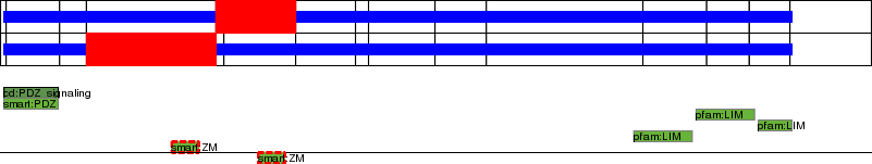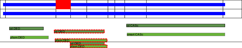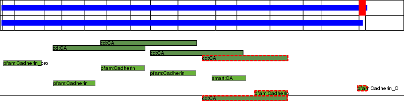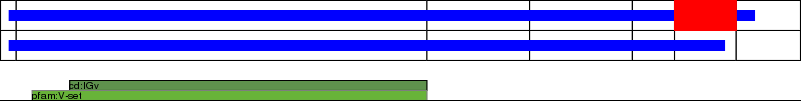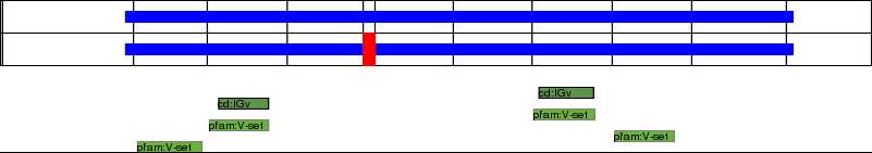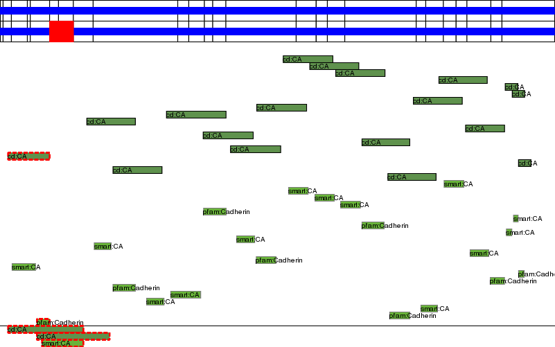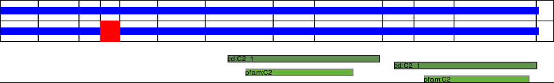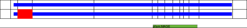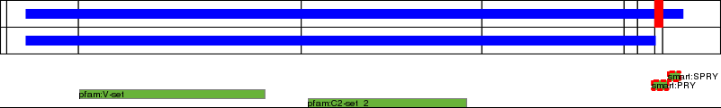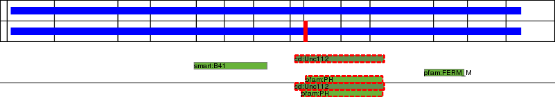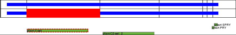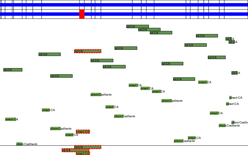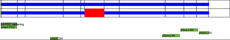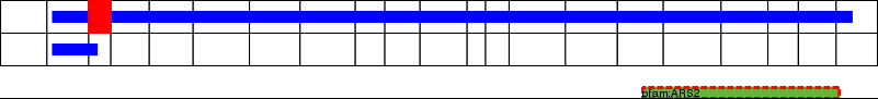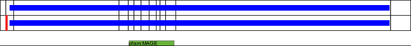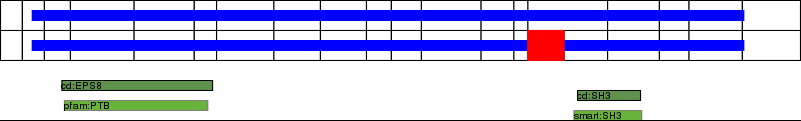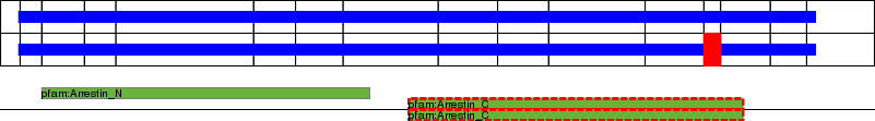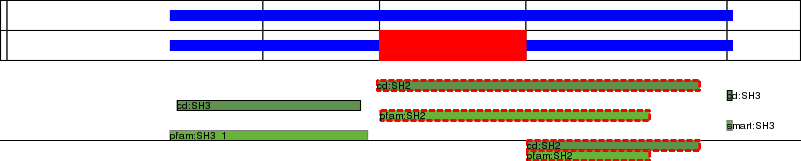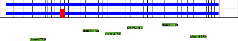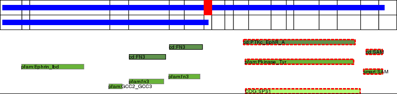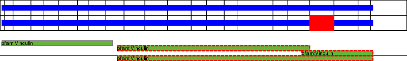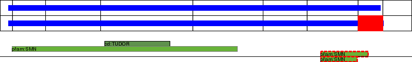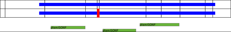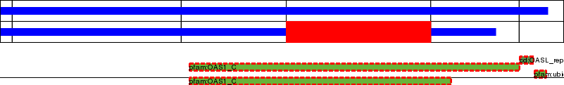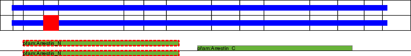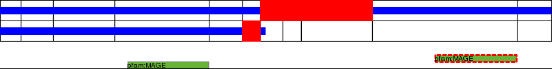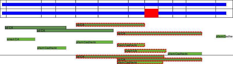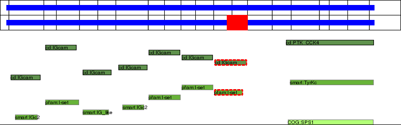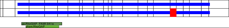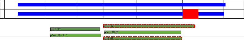 This page contains ASEs represented as a graph of the mRNA exonic structure mapped to the protein primary sequence. Exons are shown in white with black outline. The reference form is represented above the alternative form. Coding regions are shown with blue horizontal bars. These can be interrupted by red blocks for absent regions. Below are the domains in the protein obtained from NCBI's Conserved Domain Database. Domains that are affected by the ASE are outlined in red.