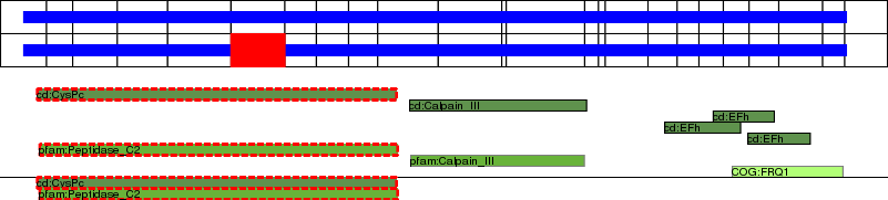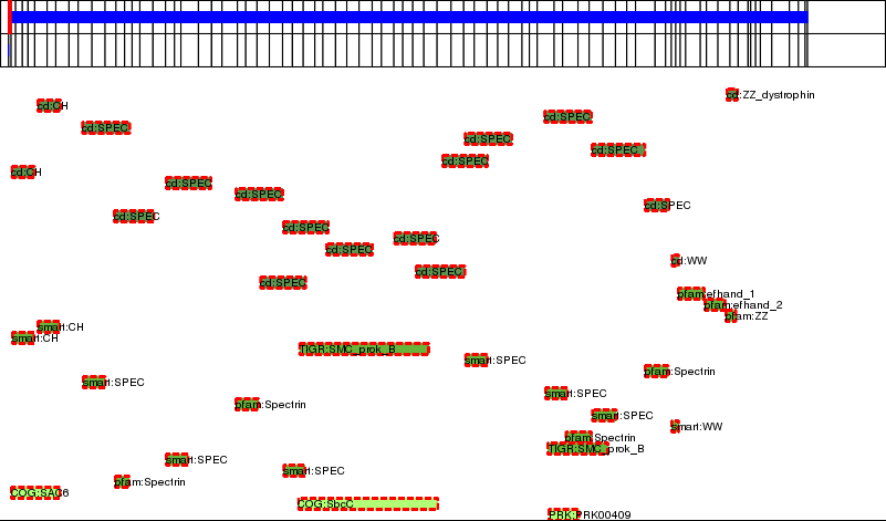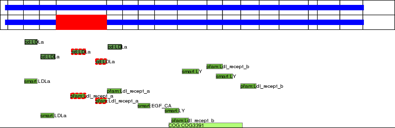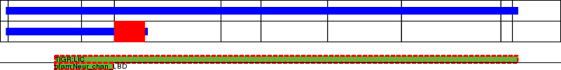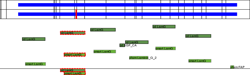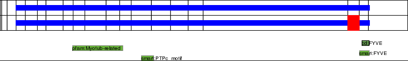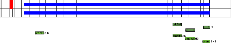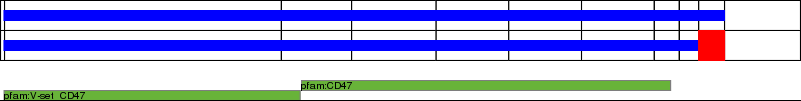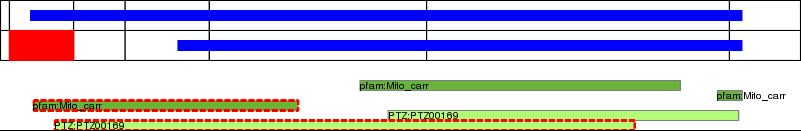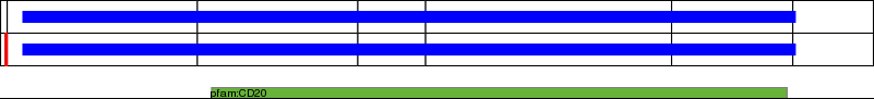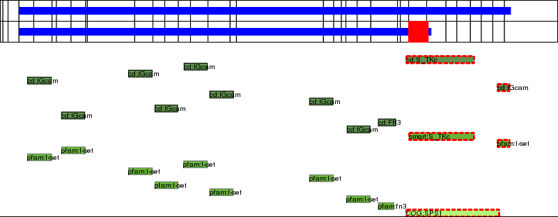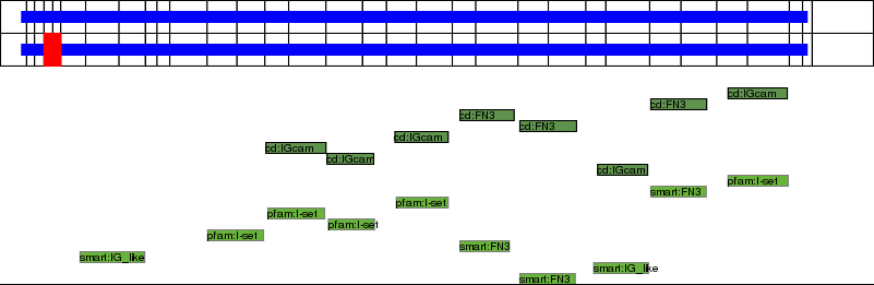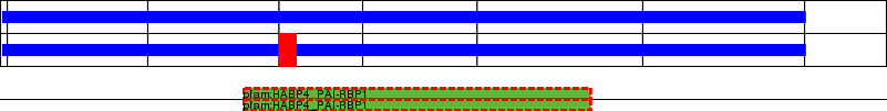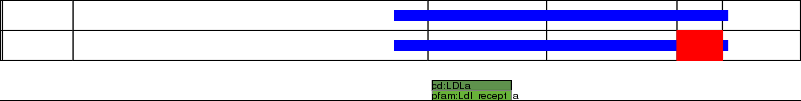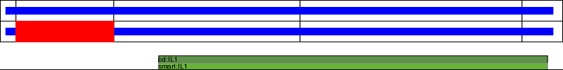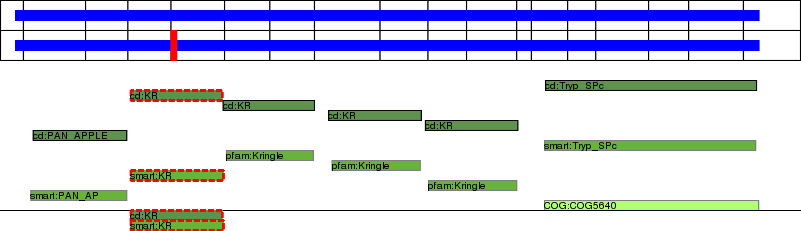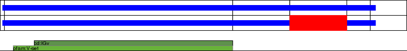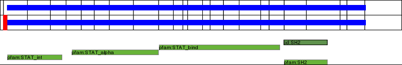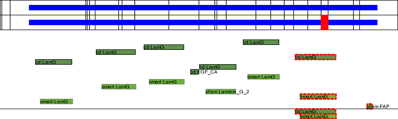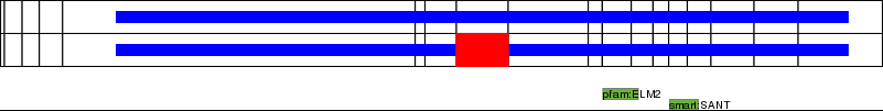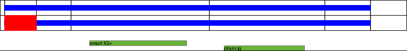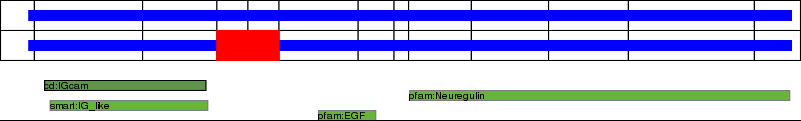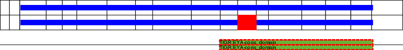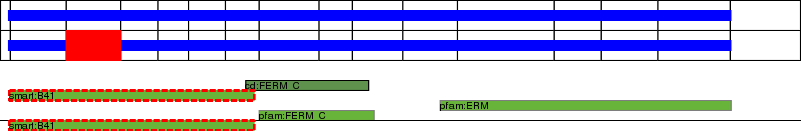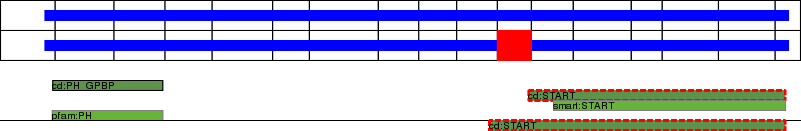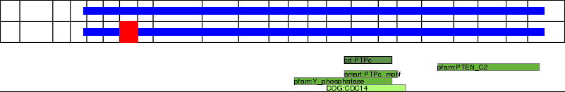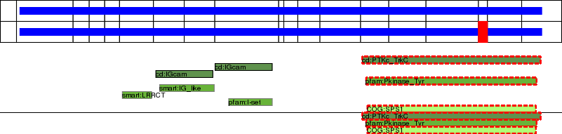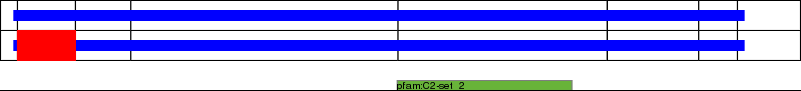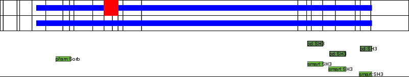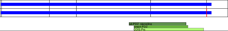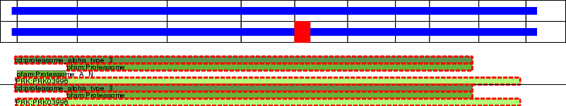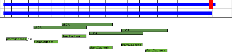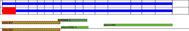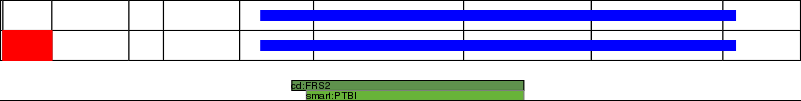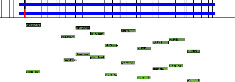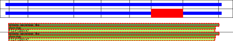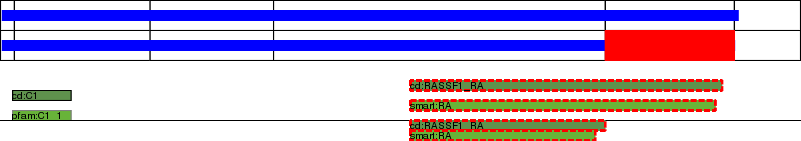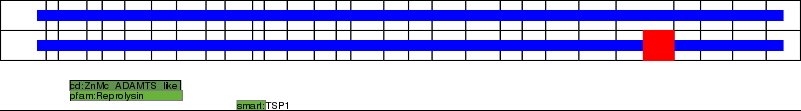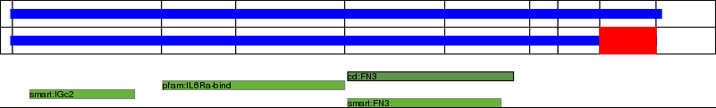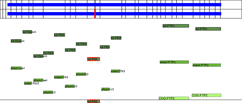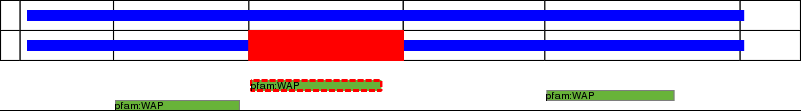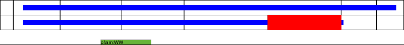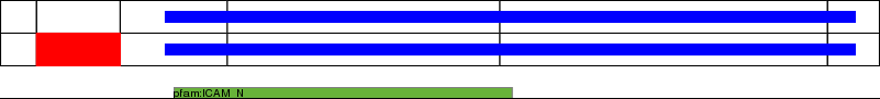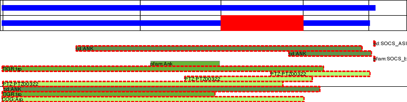 This page contains ASEs represented as a graph of the mRNA exonic structure mapped to the protein primary sequence. Exons are shown in white with black outline. The reference form is represented above the alternative form. Coding regions are shown with blue horizontal bars. These can be interrupted by red blocks for absent regions. Below are the domains in the protein obtained from NCBI's Conserved Domain Database. Domains that are affected by the ASE are outlined in red.